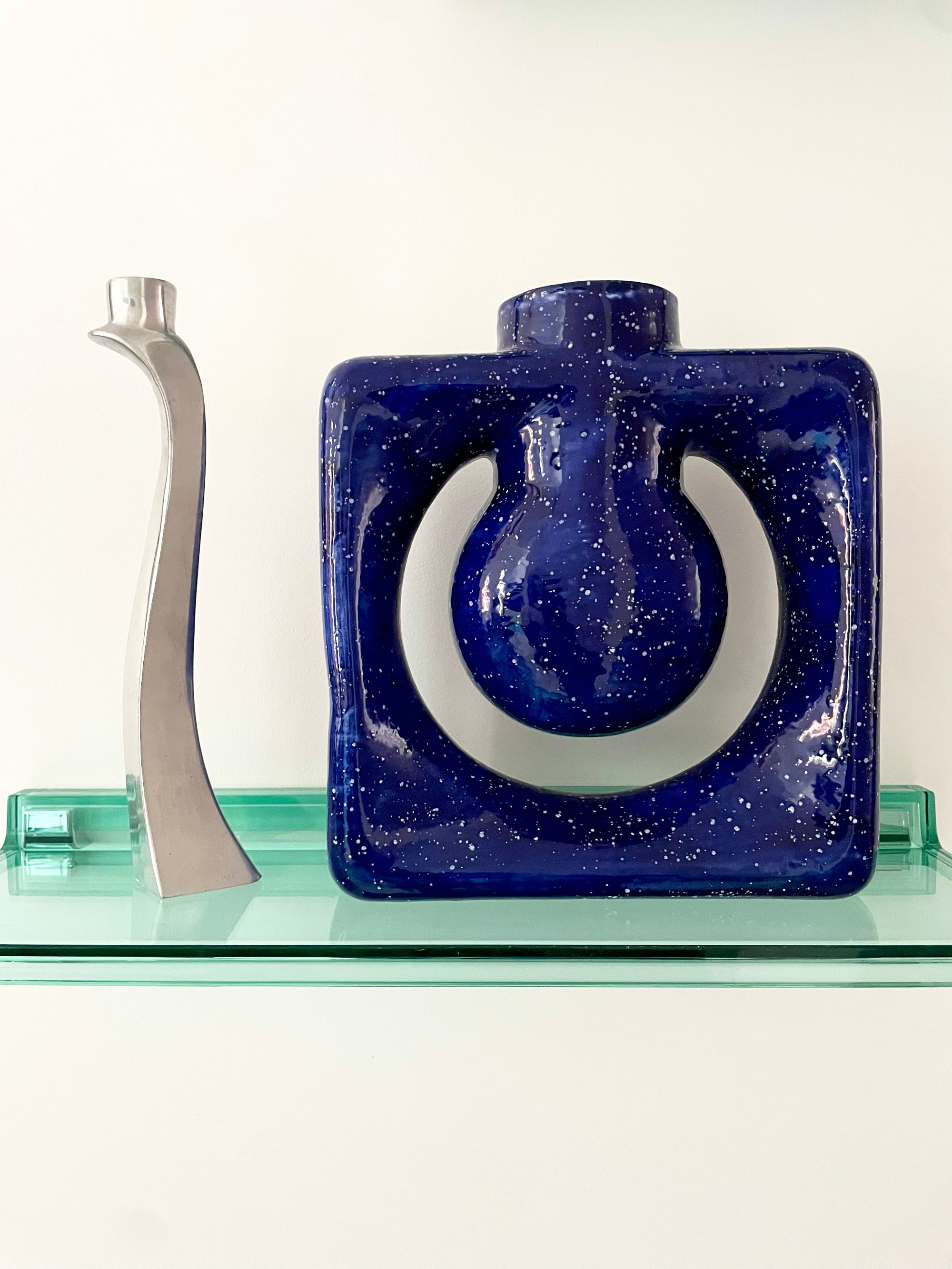 Vase en faïence blanche, émail bleu moucheté de blanc.